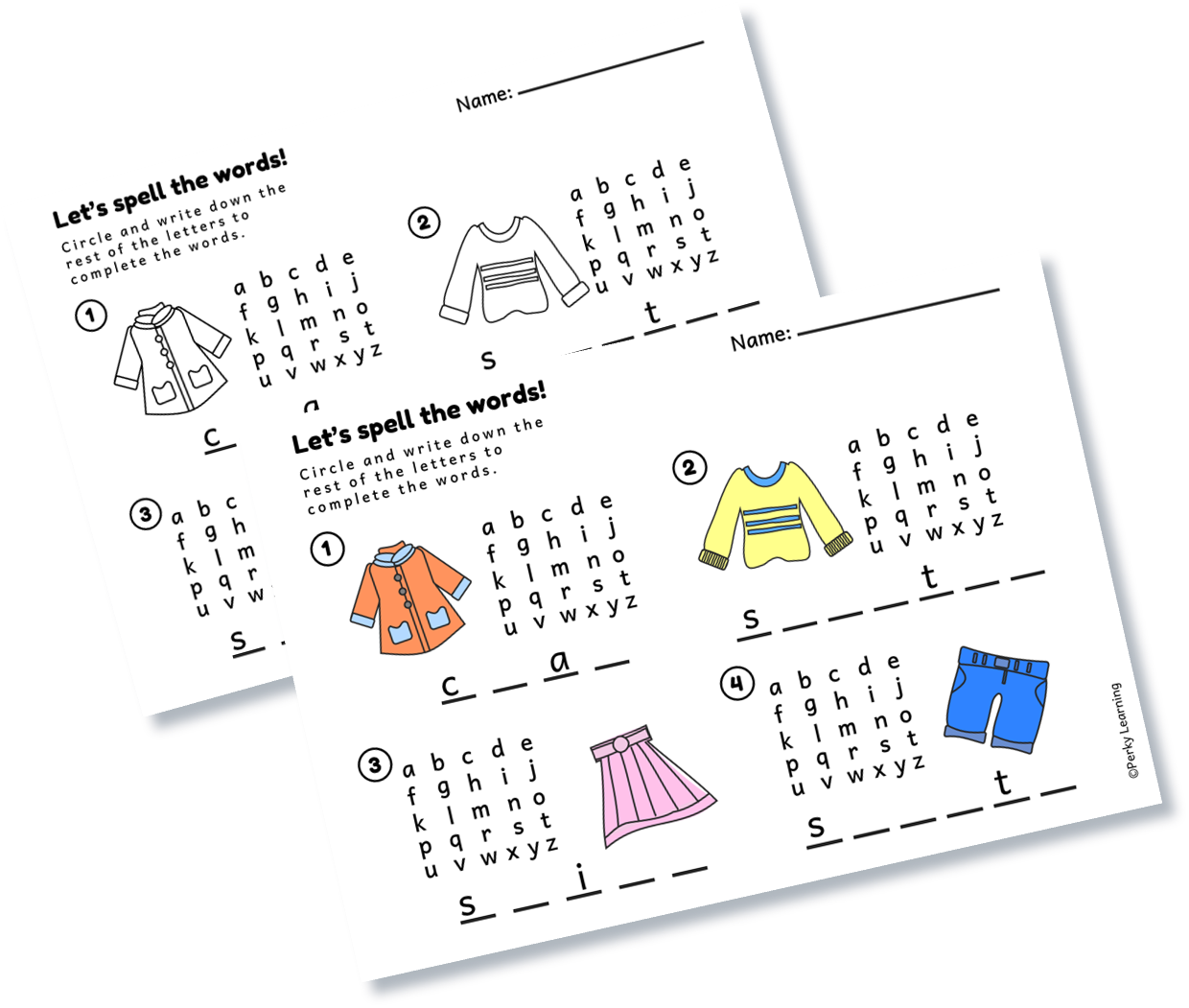 Kids observe each clothing item image and complete the word by circling the missing letters from the alphabet provided and writing them in the correct spaces, strengthening letter recognition and early spelling confidence.