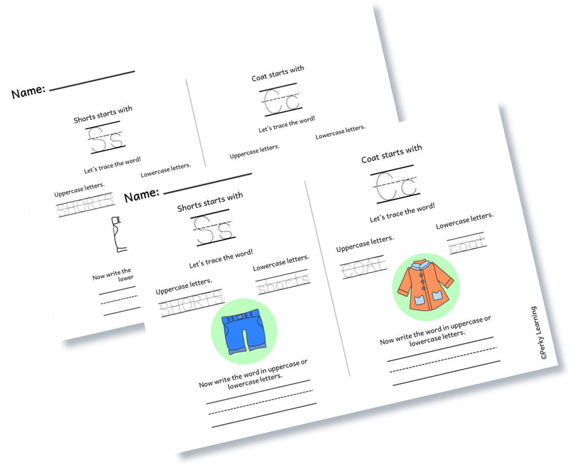 Kids start by tracing the first letter of each clothing item, then trace the full word in uppercase and lowercase, and finally use the provided lines to write the word in either uppercase or lowercase, helping them associate letters with clothing names while reinforcing fine motor skills and early writing confidence.