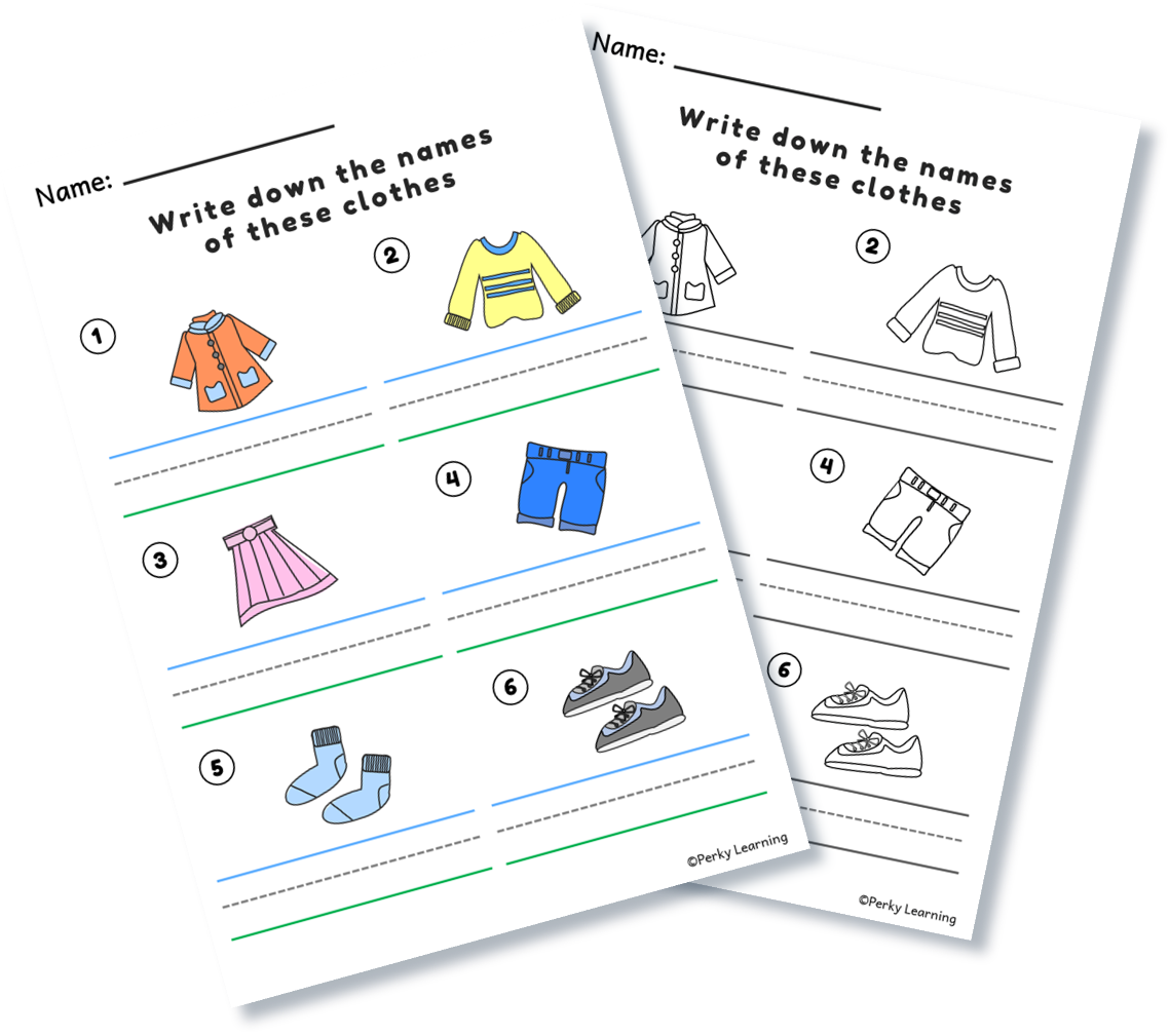 This free printable clothes writing activity is designed for children ages 3–6 to build early writing, spelling, and vocabulary skills.