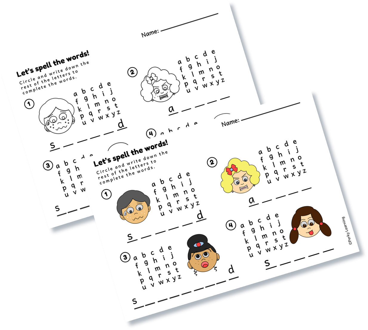 Kids look at facial expressions and complete each emotion word by circling the missing letters from the alphabet provided and writing them in place, supporting letter recognition and word formation.