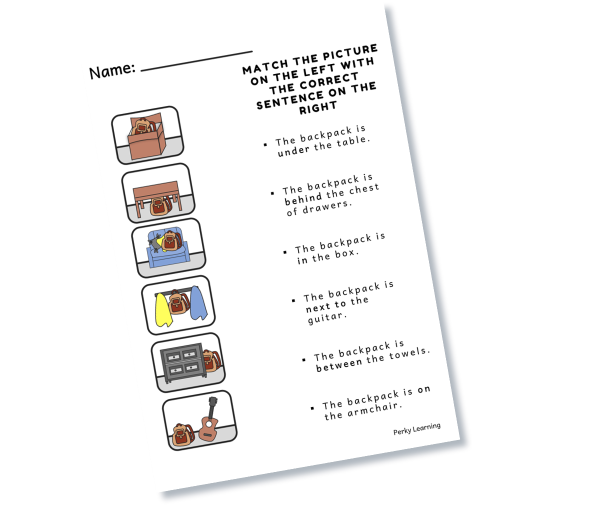 This free printable prepositions of place matching activity is designed for children ages 6–8 to practice prepositions such as in, on, under, between, next to, and behind.