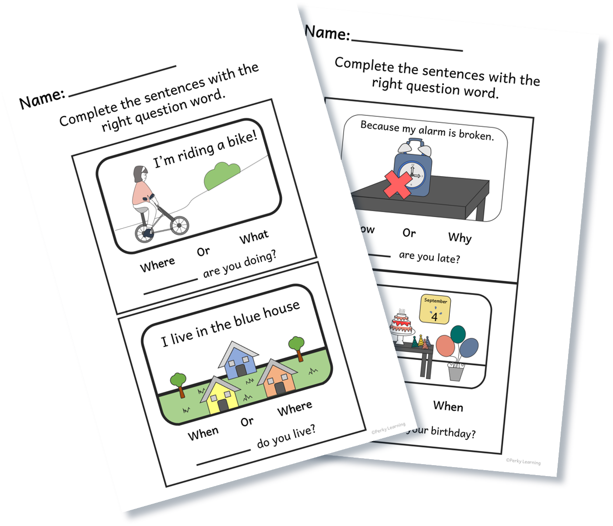 Kids look at an image and complete the question by choosing the correct question word from two options provided. This activity helps children understand question meaning, sentence structure, and reading comprehension while building confidence with grammar in a hands-on, screen-free way.