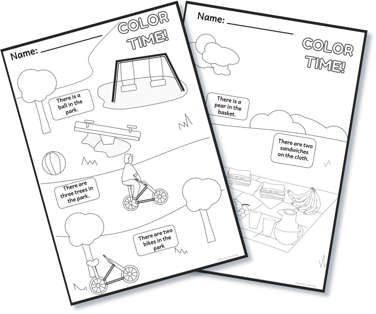 Kids color a detailed scene while reading short sentences that use “There is” and “There are” to describe what they see. The text is used to reinforce grammar and reading comprehension, while children enjoy a creative, screen-free activity.